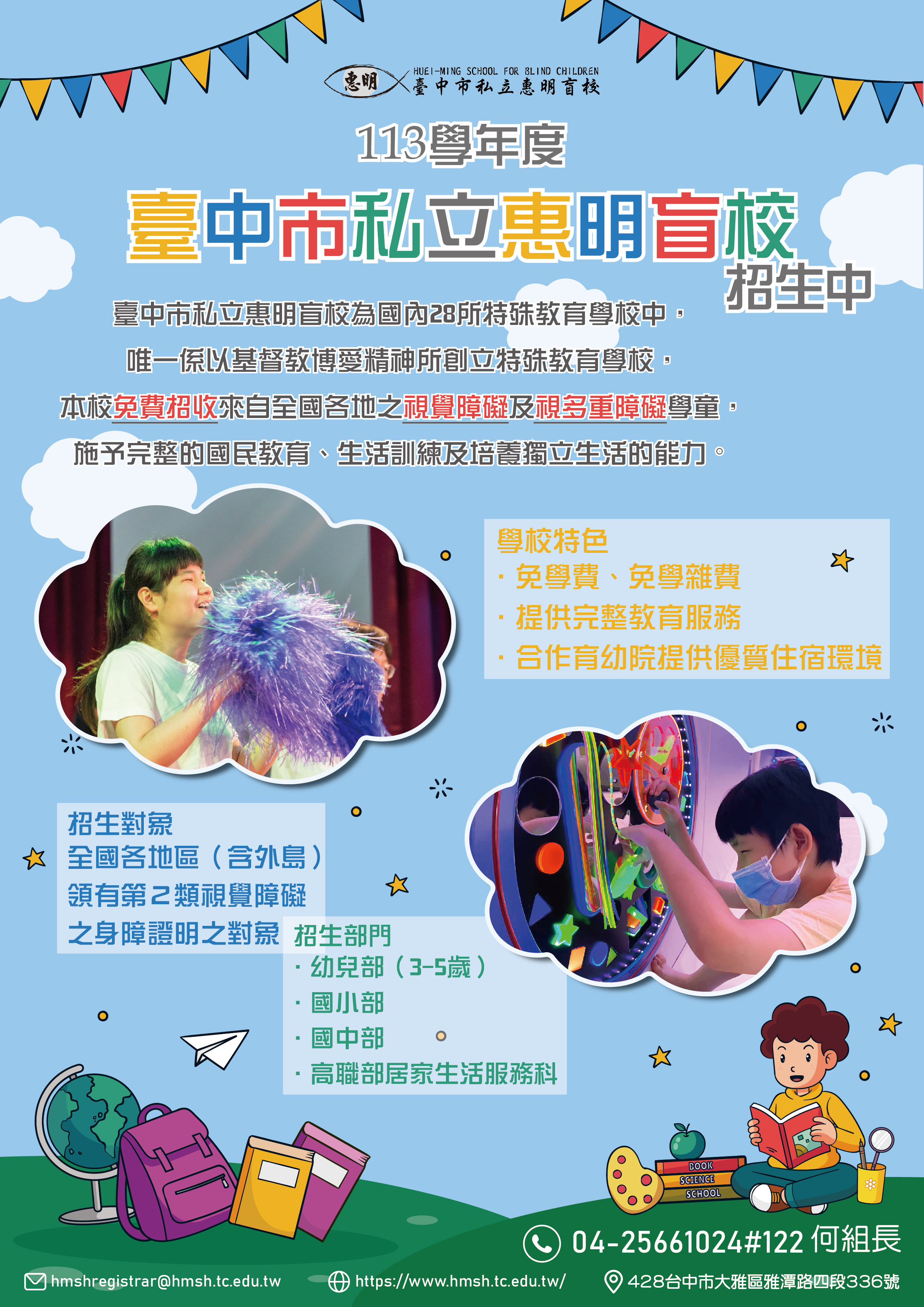 - 依據:臺中市私立惠明盲校112學年度教務工作計畫排定之招生宣導活動辦理